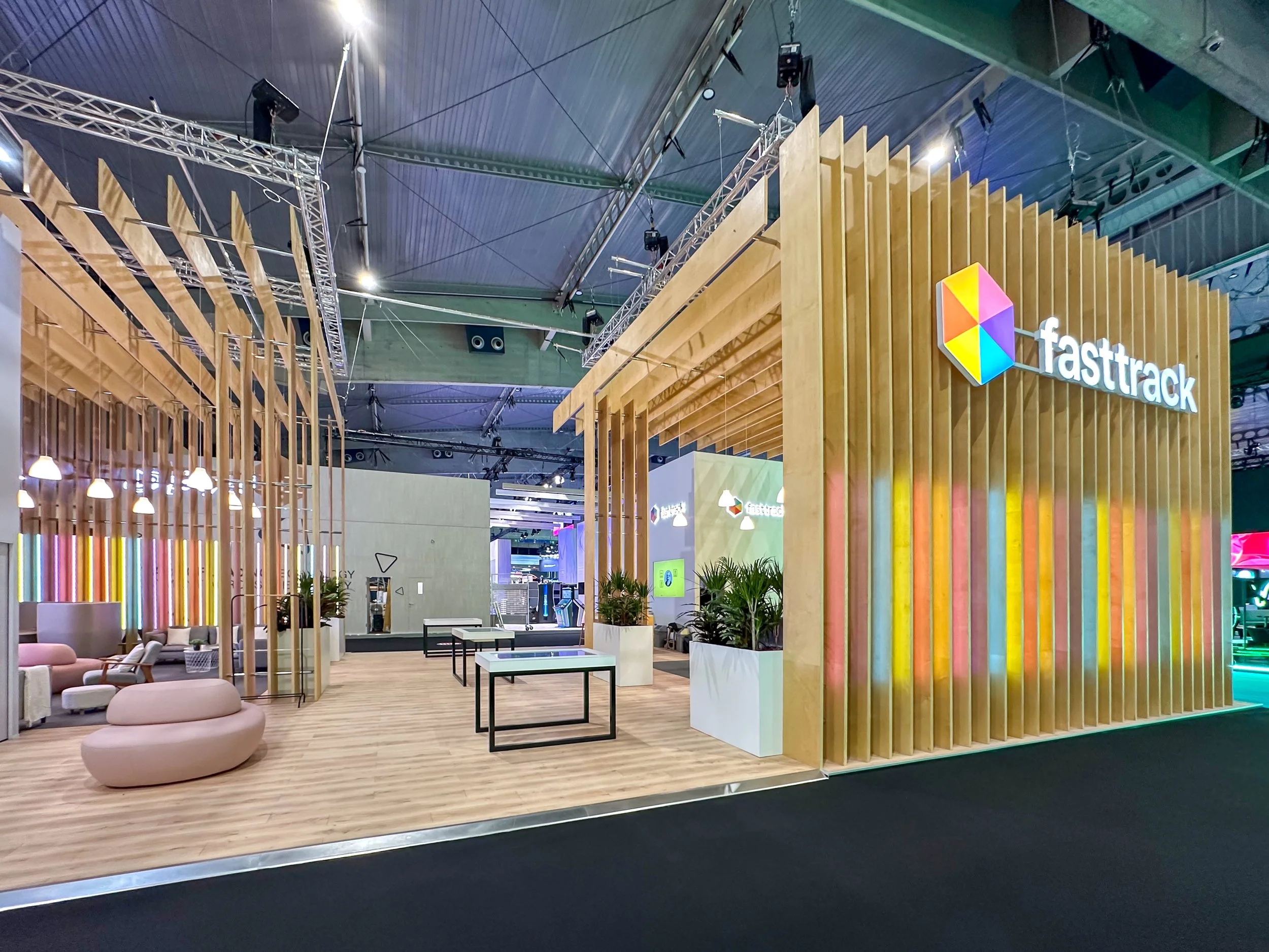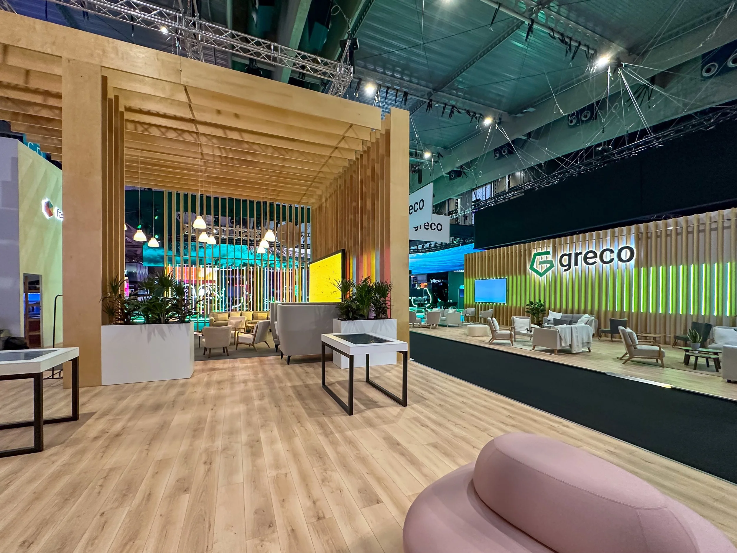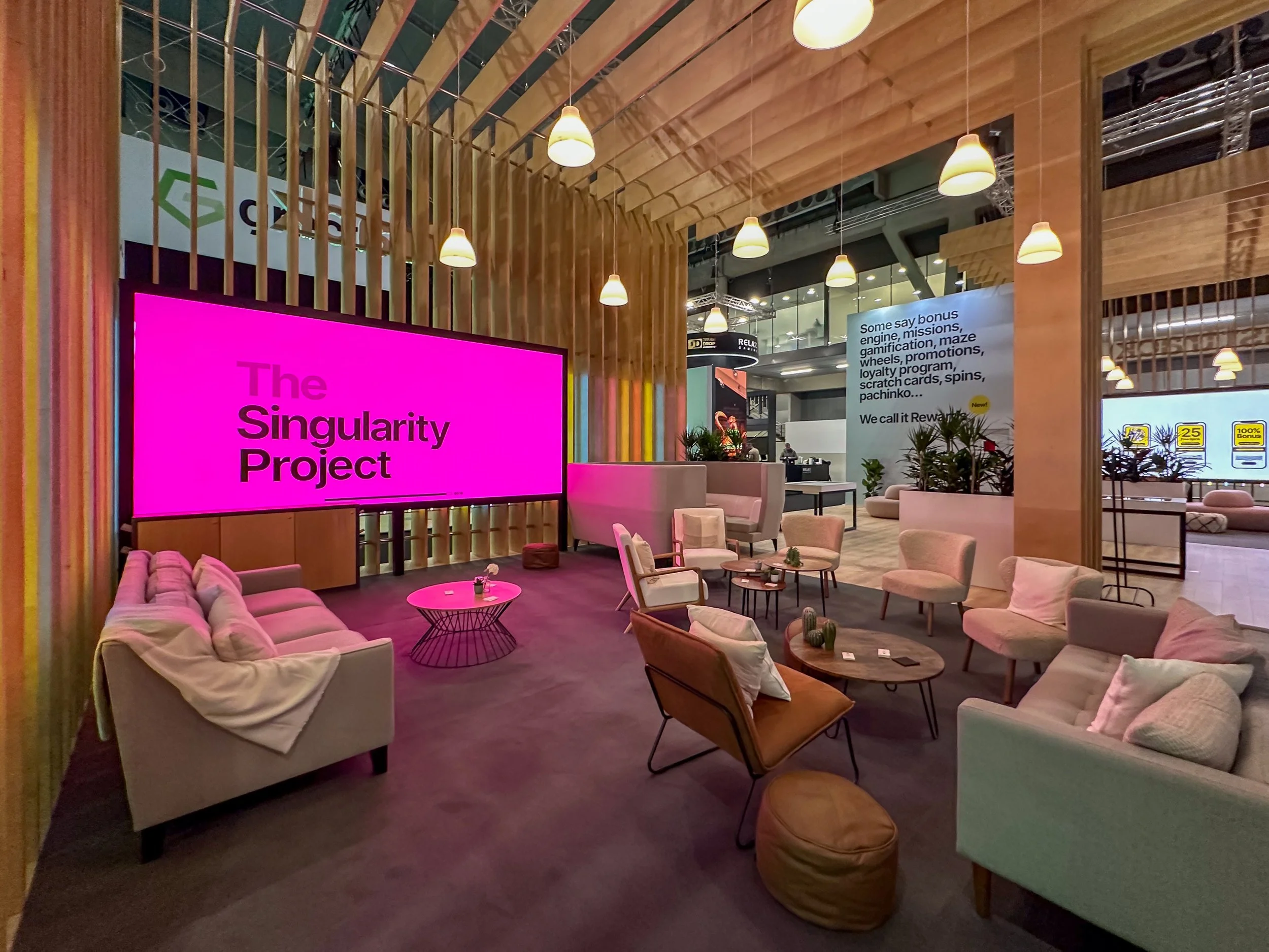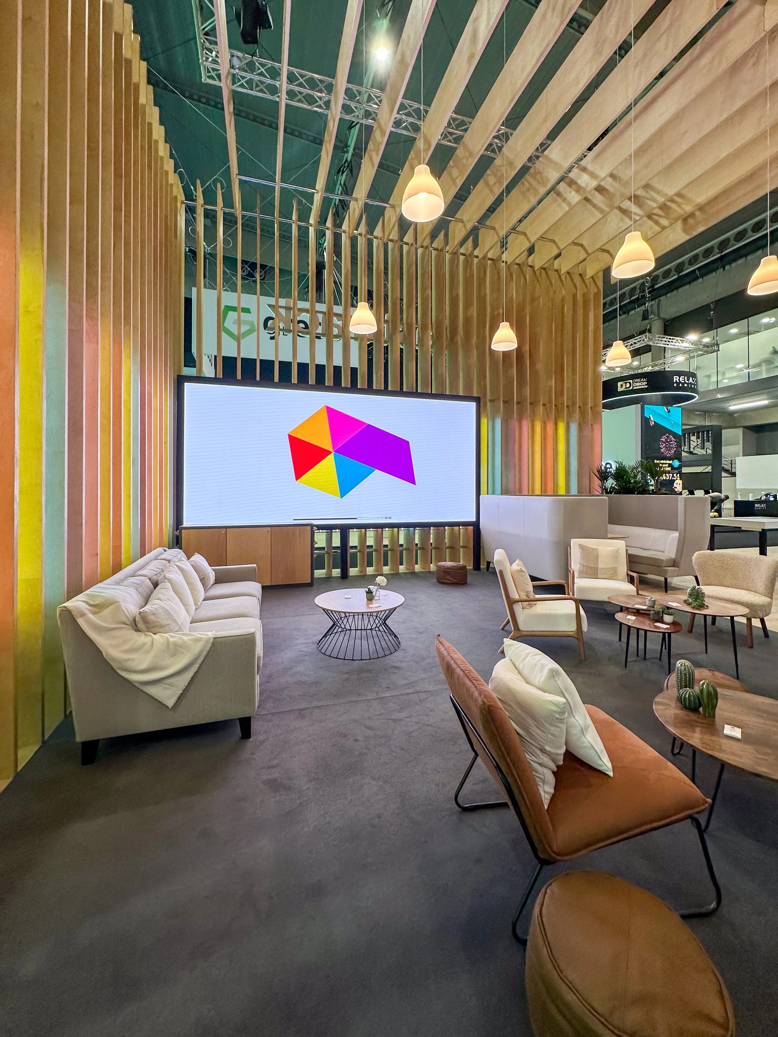 At ICE Barcelona earlier this year, we brought a client’s vision to life with a stand designed to feel warm and inviting. A striking wooden frame and soft pendant lights created the atmosphere, while comfortable seating encouraged visitors to pause, relax, and connect. The result was a space that felt more like a lounge than a booth.