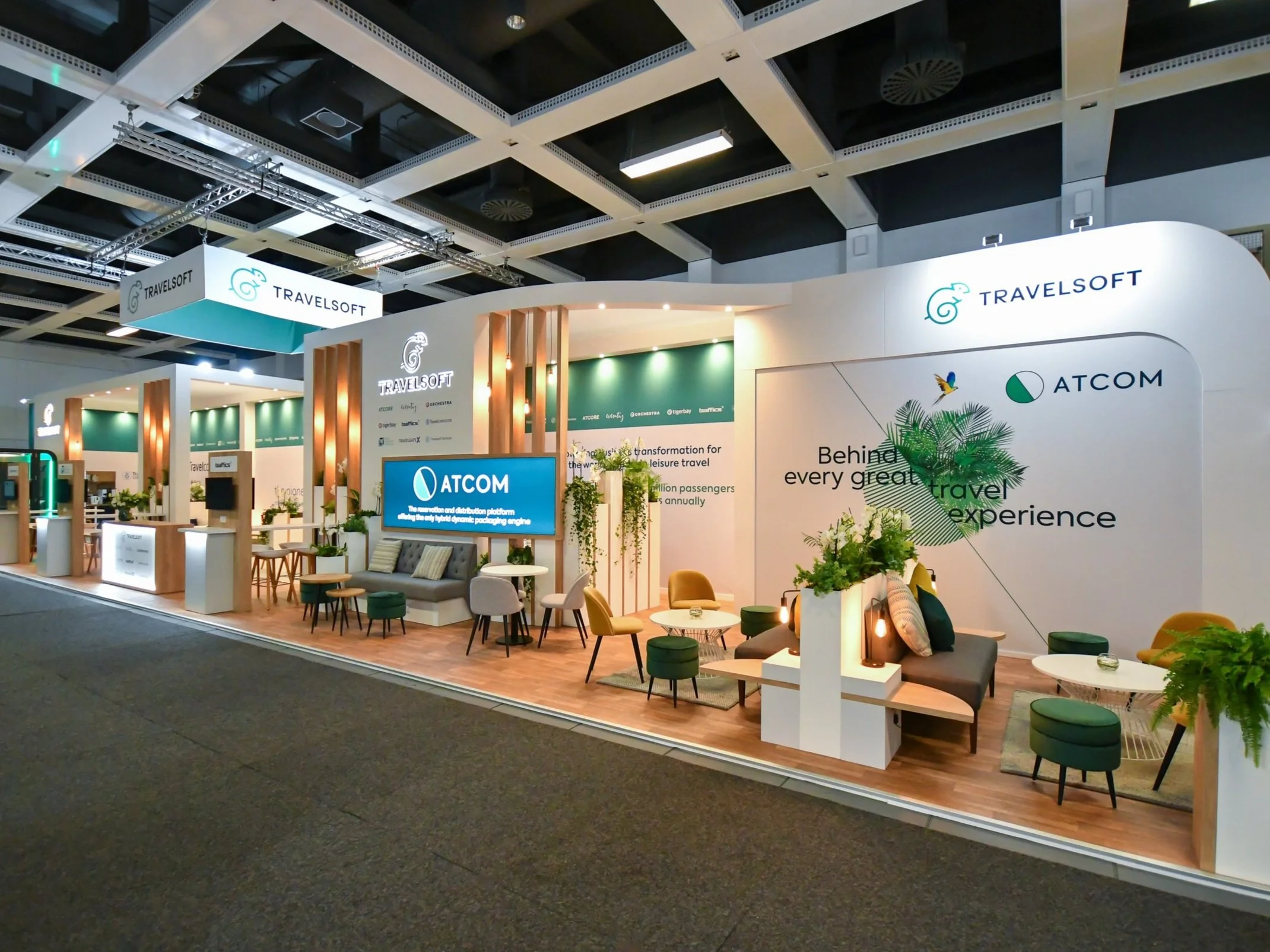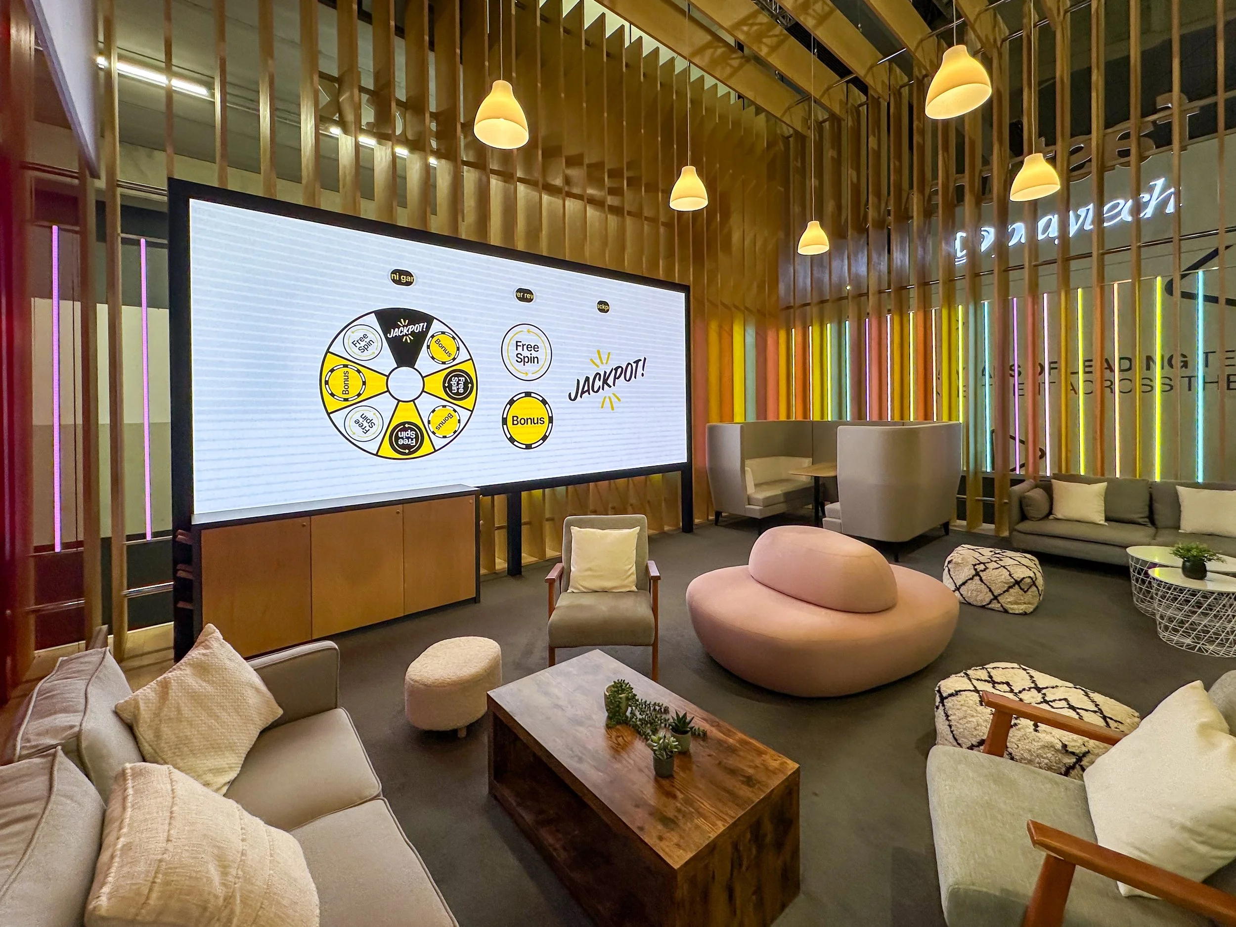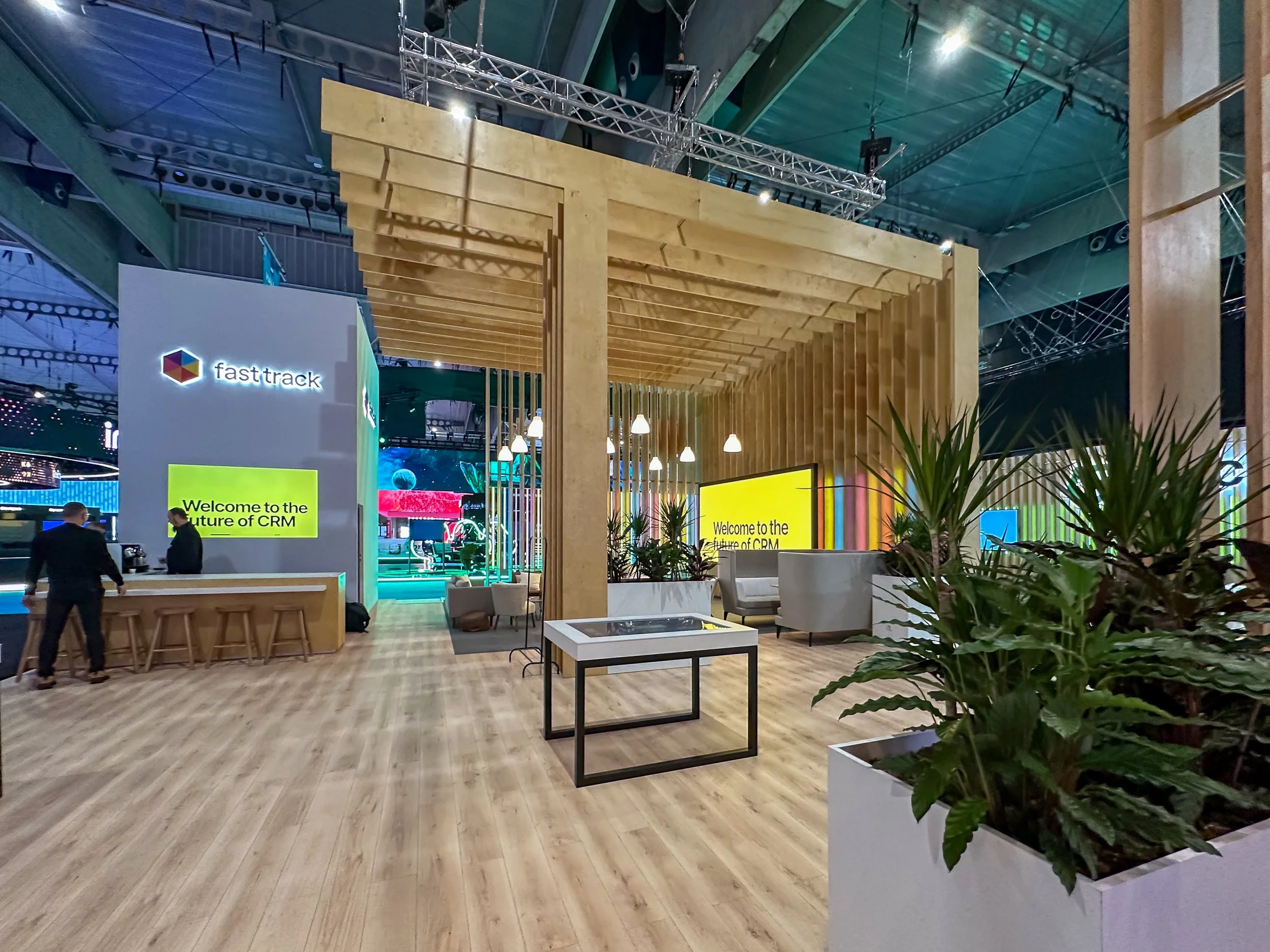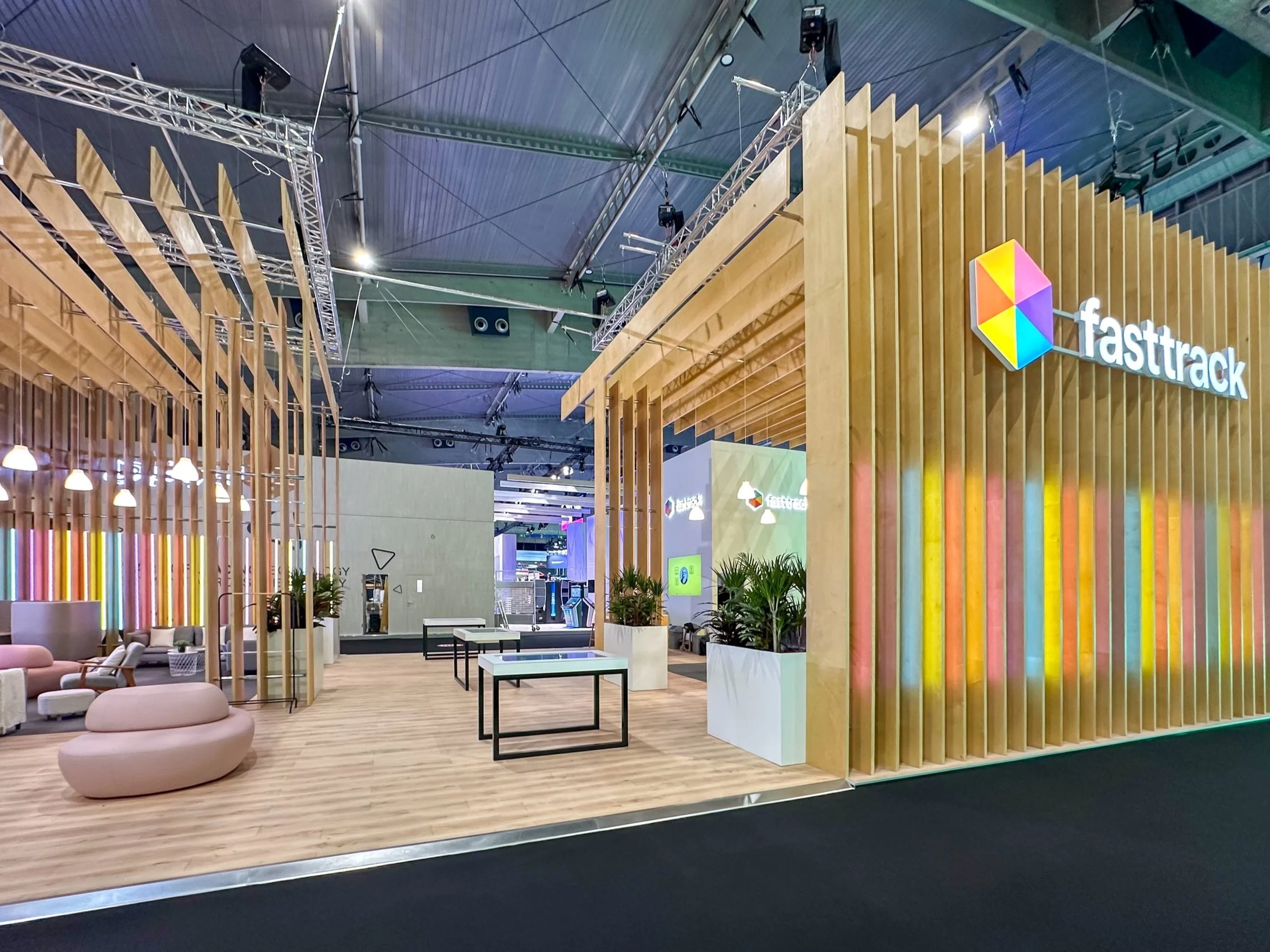 At ICE Barcelona earlier this year, we brought a client’s vision to life with a stand designed to feel warm and inviting. A striking wooden frame and soft pendant lights created the atmosphere, while comfortable seating encouraged visitors to pause, relax, and connect. The result was a space that felt more like a lounge than a booth.